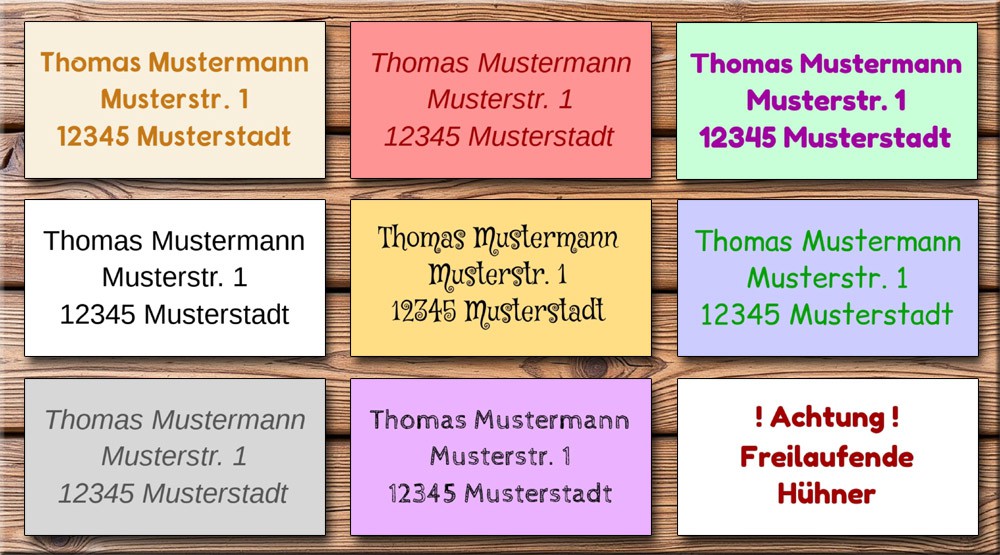 Hochwertige, selbstklebende Adressaufkleber – perfekt für Briefumschläge und andere glatte Flächen, mit verschiedenen Hintergrundfarben, Textfarben und Schriftarten zur Auswahl.