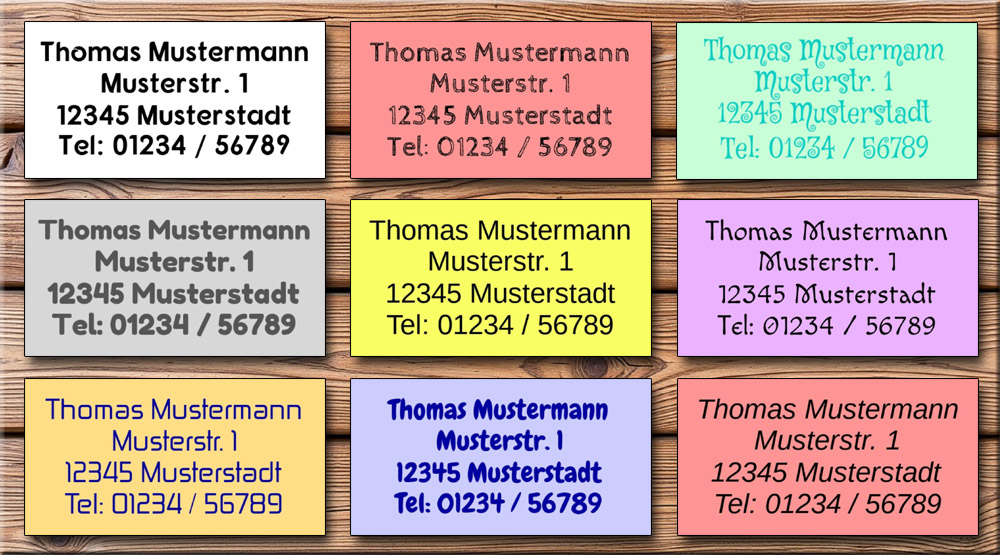 Hochwertige, selbstklebende Adressaufkleber – perfekt für Briefumschläge und andere glatte Flächen, mit verschiedenen Hintergrundfarben, Textfarben und Schriftarten zur Auswahl.