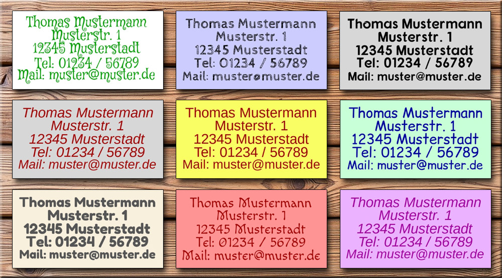 Hochwertige, selbstklebende Adressaufkleber – perfekt für Briefumschläge und andere glatte Flächen, mit verschiedenen Hintergrundfarben, Textfarben und Schriftarten zur Auswahl.