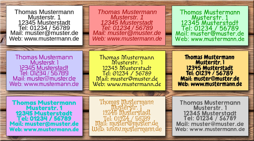Hochwertige, selbstklebende Adressaufkleber – perfekt für Briefumschläge und andere glatte Flächen, mit verschiedenen Hintergrundfarben, Textfarben und Schriftarten zur Auswahl.